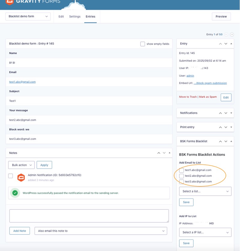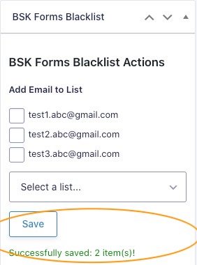 From the "BSK Forms Blacklist Actions" section, check the box next to the email address(es) you wish to add to a list.
